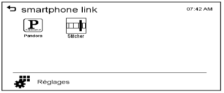 Si le téléphone intelligent n'est pas connecté au système infodivertissement ou si l'application n'est pas installée sur le téléphone intelligent, le menu Stitcher n'est pas activé.