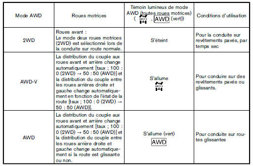 Le systeme de toutes roues motrices (AWD) permet de se lectionner le mode 2WD (deux roues motrices), AWD-V ou AWD, en fonction des conditions de conduite.