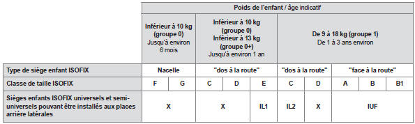 X : place non adaptée à l'installation d'un siège ISO FIX de la classe de taille indiquée.